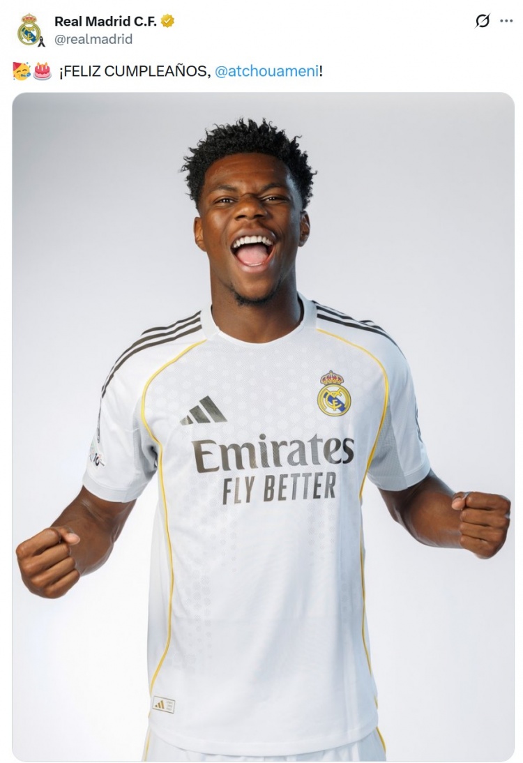 皇马官方社媒晒出琼阿梅尼的照片,配文:“生日快乐,琼阿梅尼!”